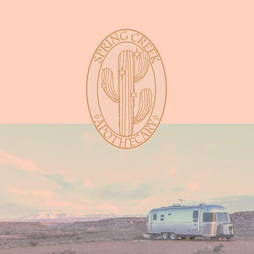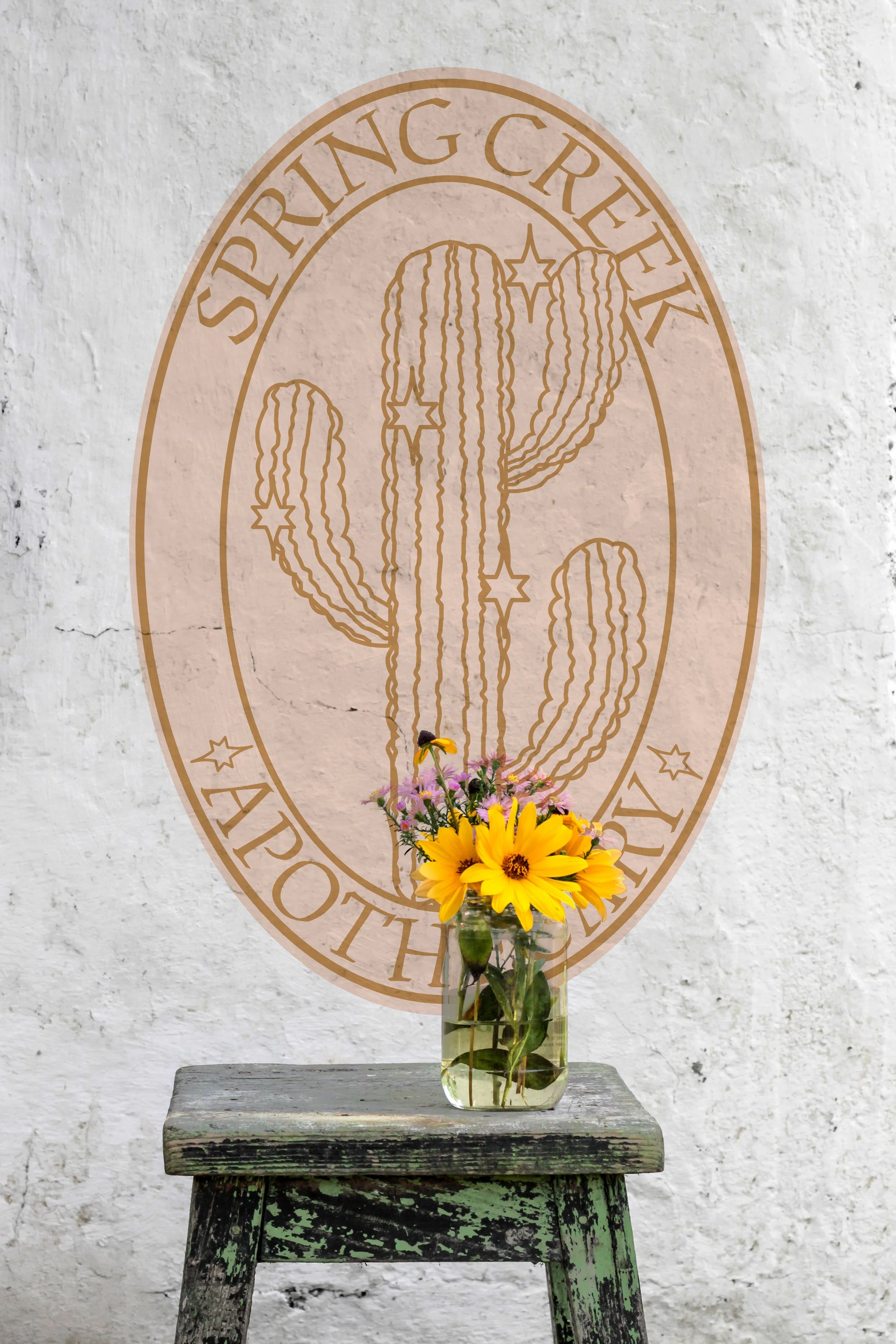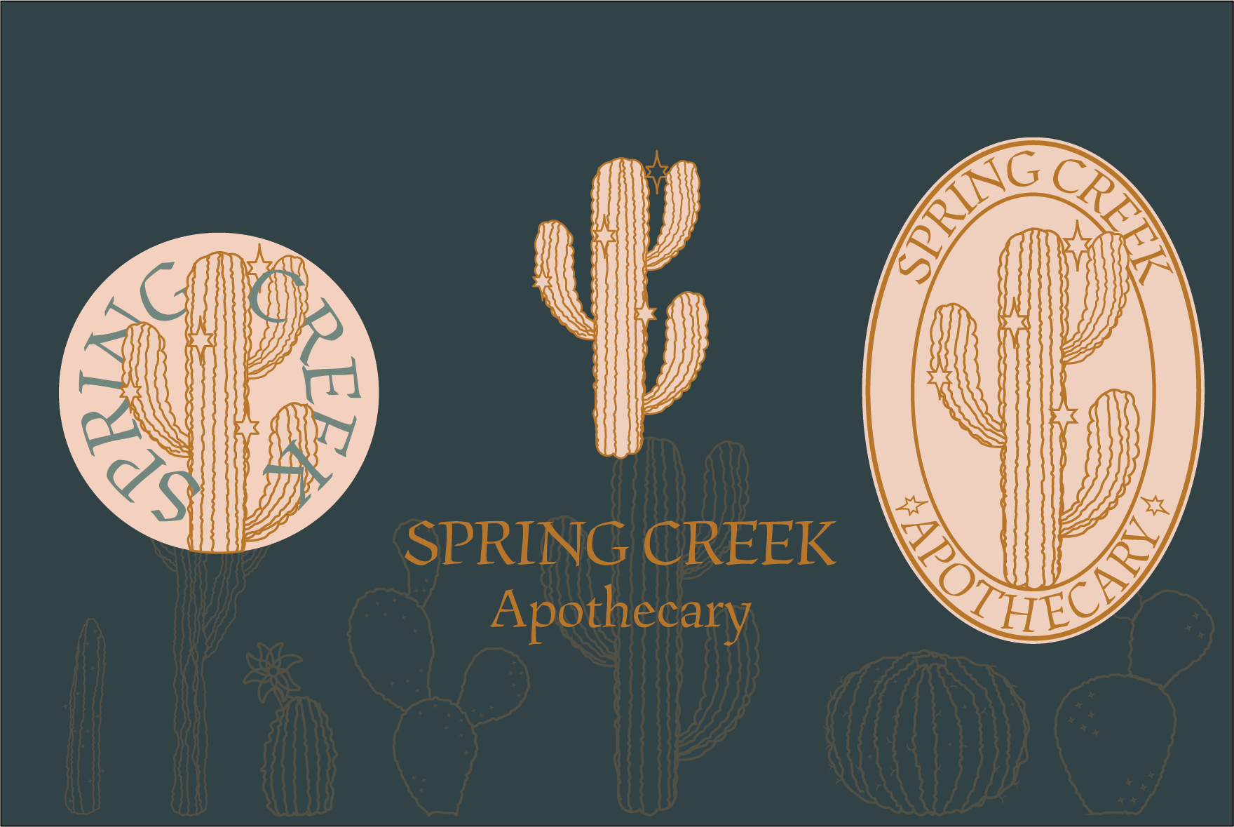 The logo for Spring Creek Apothecary showcases the iconic Saguaro Cactus, native to the region. This majestic cactus is embellished with an elongated polygon star, reminiscent of the delicate flowers that grace its spiny arms. The same star shape encompasses the companies initials SC, and are fashioned on the sides of the cactus. The design is encased within in an oval, while the company's name frames the logo in a warm, inviting copper hue.