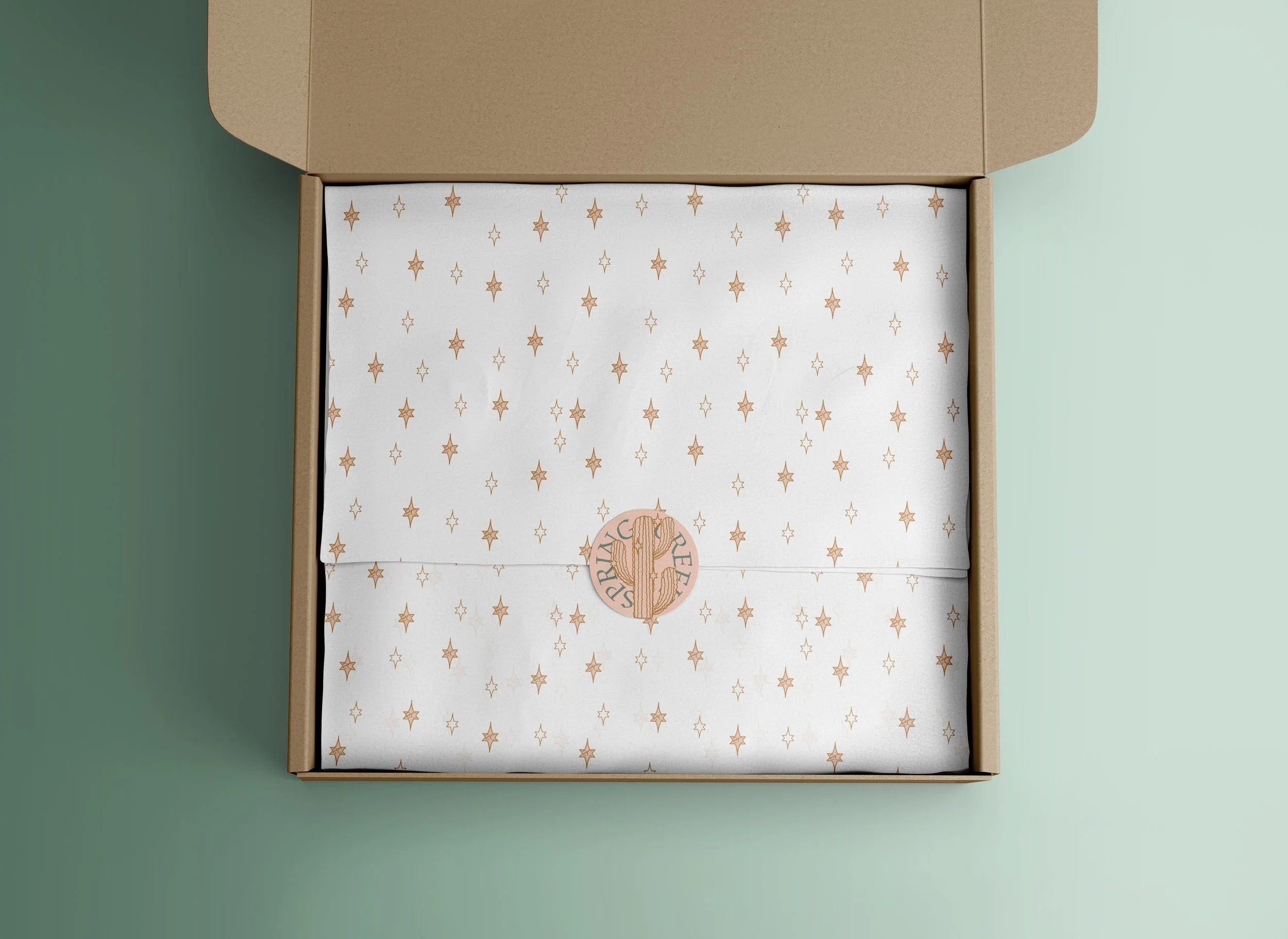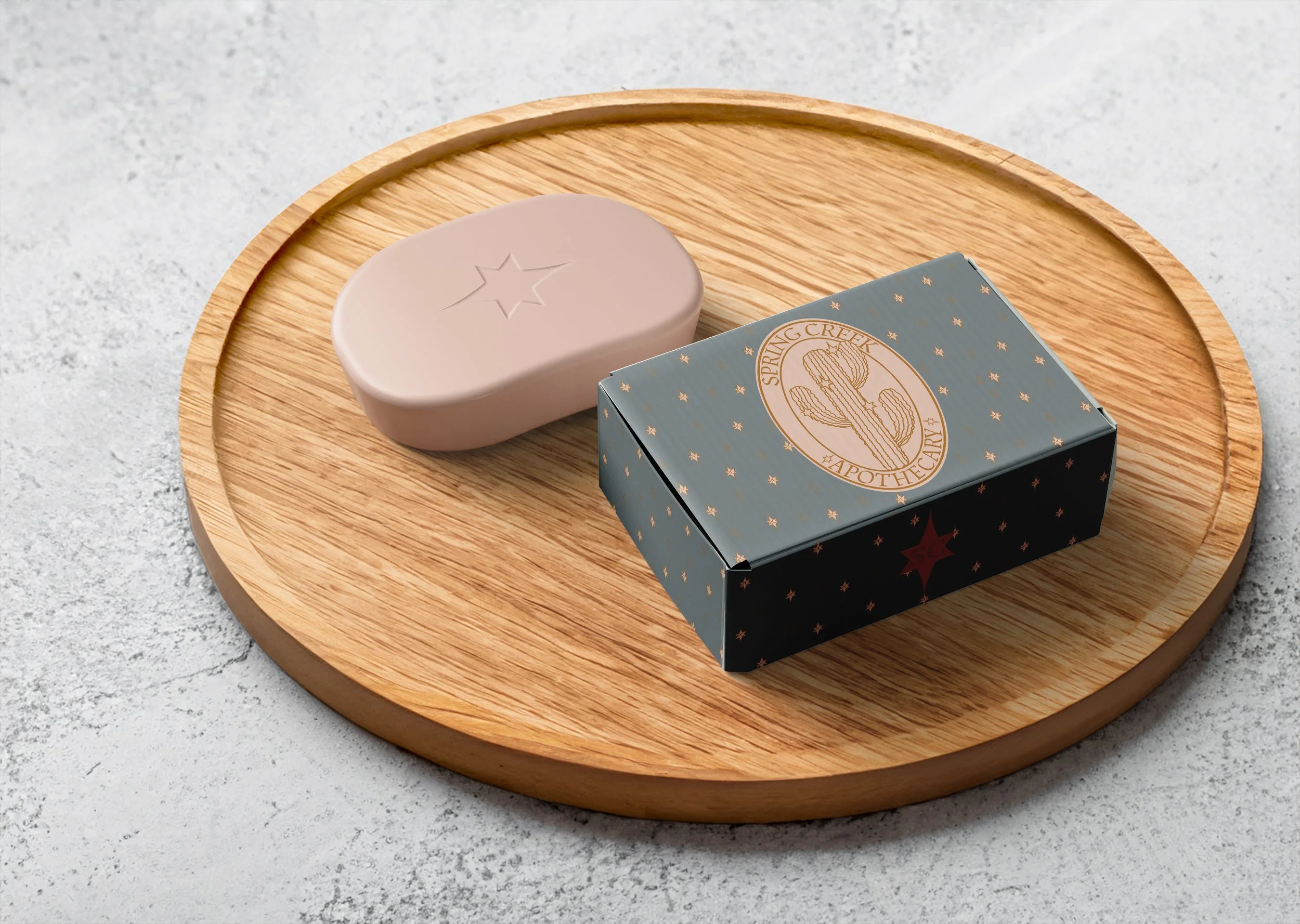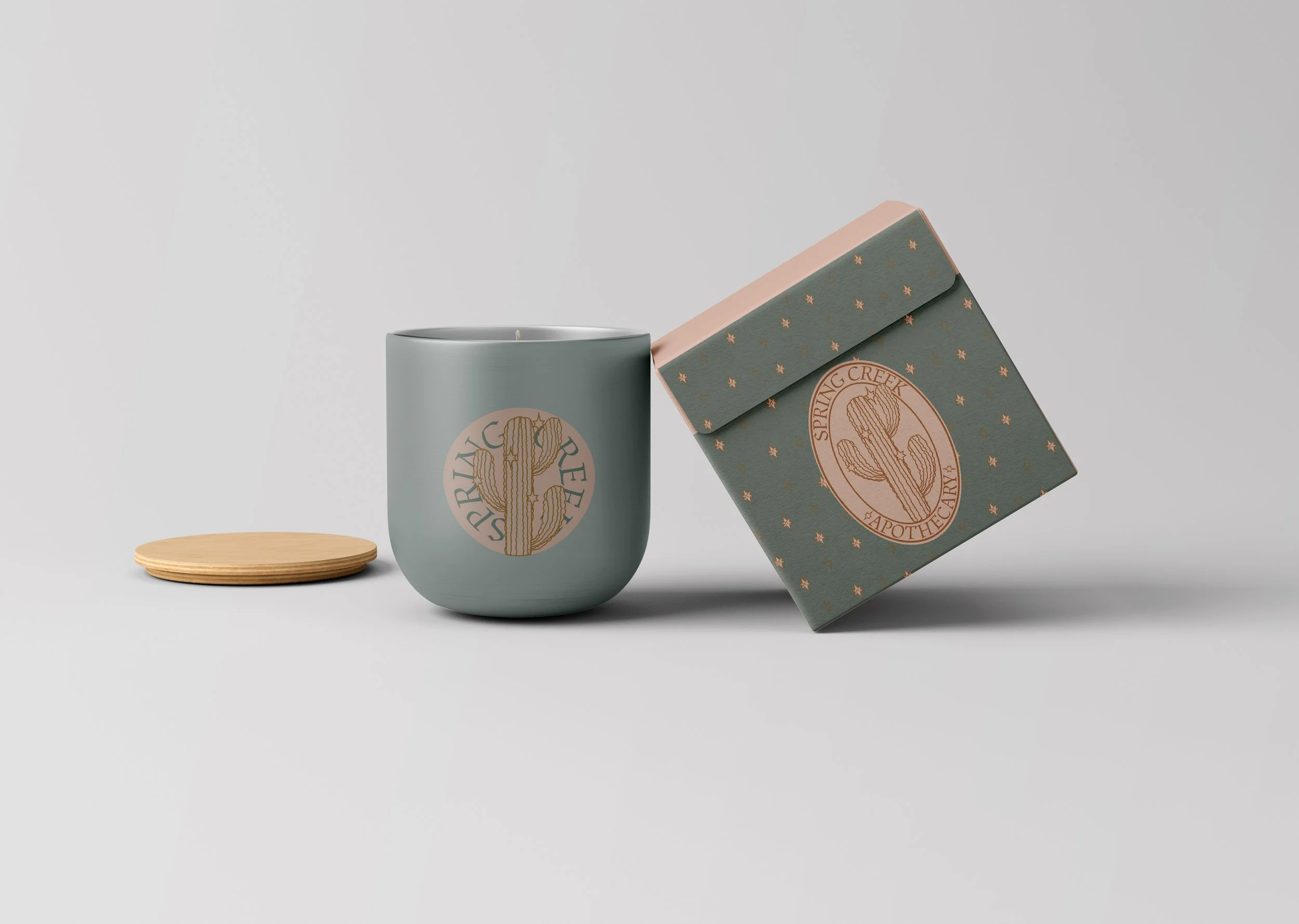 The logo for Spring Creek Apothecary showcases the iconic Saguaro Cactus, native to the region. This majestic cactus is embellished with an elongated polygon star, reminiscent of the delicate flowers that grace its spiny arms. The same star shape encompasses the companies initials SC, and are fashioned on the sides of the cactus. The design is encased within in an oval, while the company's name frames the logo in a warm, inviting copper hue.