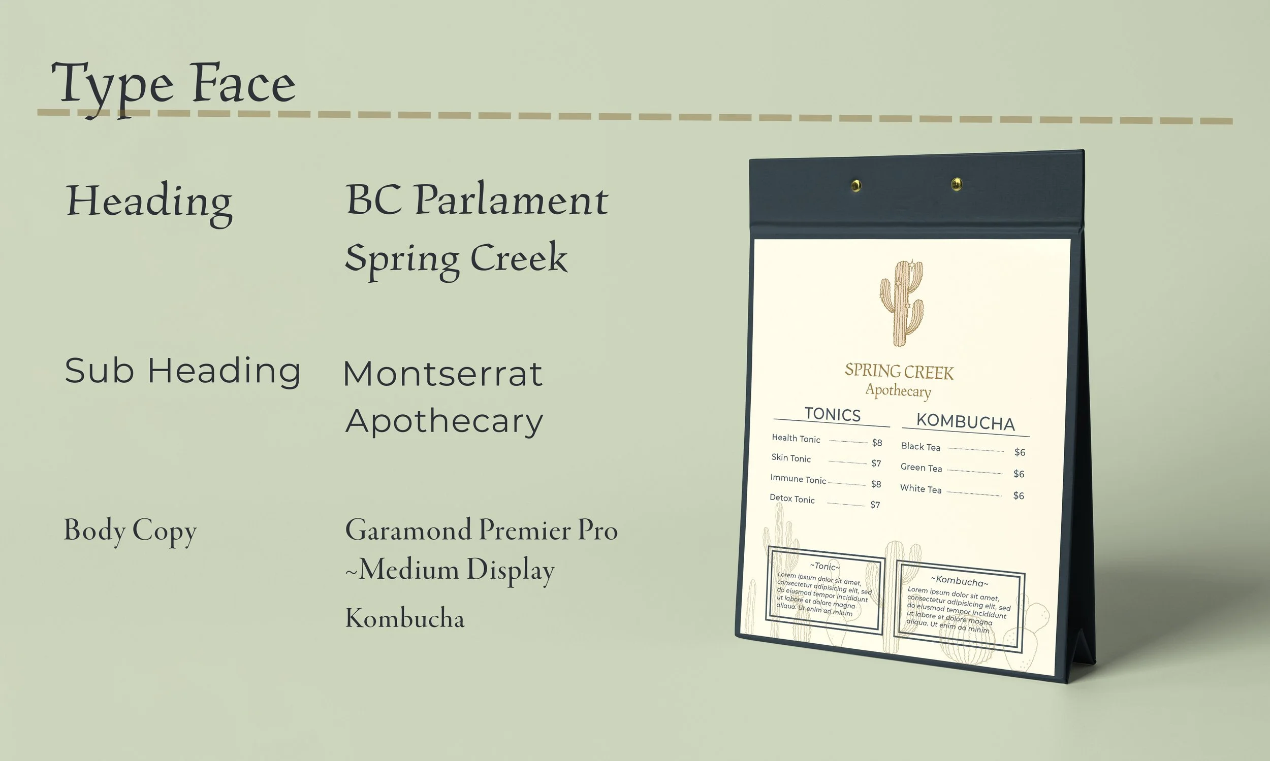 Spring Creek’s color palette is made of muted sage green and dusty terracotta accents evoking the natural flora and clay earth found in the arid environment of the desert. Together, these colors create a harmonious and tranquil atmosphere, echoing the peace and stillness of the desert landscape. This color scheme infuses the apothecary with a sense of calm, balance, and natural beauty, aligning perfectly with its purpose of offering healing and wellness in the midst of the desert's vast and peaceful expanse.