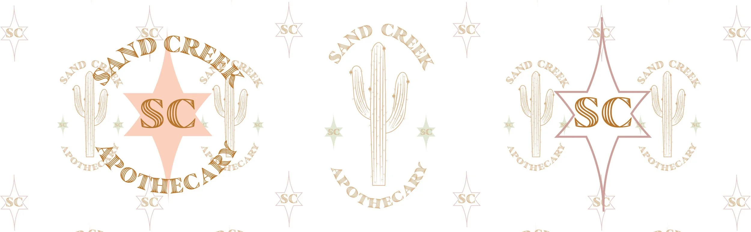 The logo for Sand Creek Apothecary showcases the iconic Saguaro Cactus, native to the region. This majestic cactus is embellished with an elongated polygon star, reminiscent of the delicate flowers that grace its spiny arms. The same star shape encompasses the companies initials SC, and are fashioned on the sides of the cactus. The design is encased within in an oval, while the company's name frames the logo in a warm, inviting copper hue.